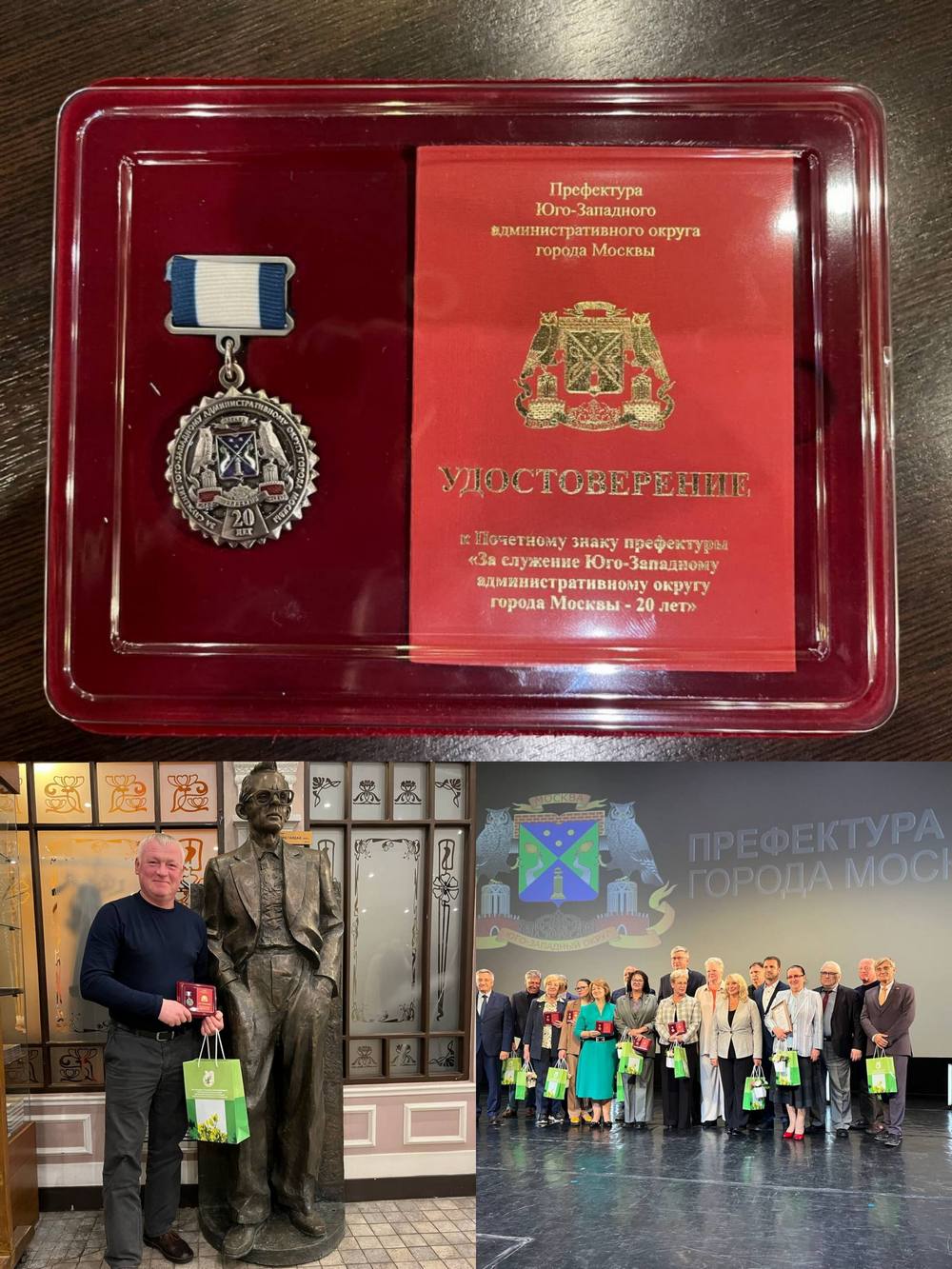 В этот вечер на сцене киноконцертного зала "Эльдар" директор Дворца творчества детей и молодежи «Севастополец» Александр Искандарович Исхаков получил заслуженную награду — Почётный знак префектуры «За служение Юго-Западному административному округу города Москвы — 20 лет».