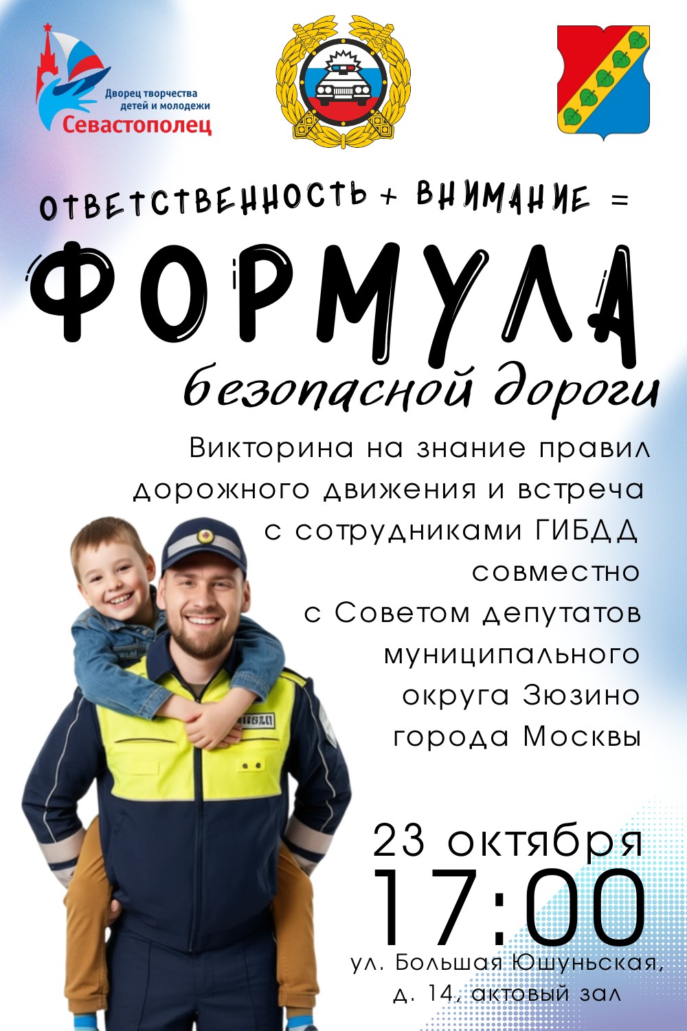 23 октября в 17:00 в актовом зале Дворца творчества детей и молодежи "Севастополец" (ул. Большая Юшуньская, д. 14) состоится тематическая викторина по правилам дорожного движения и встреча с представителями ГИБДД, и Управы района Зюзино.