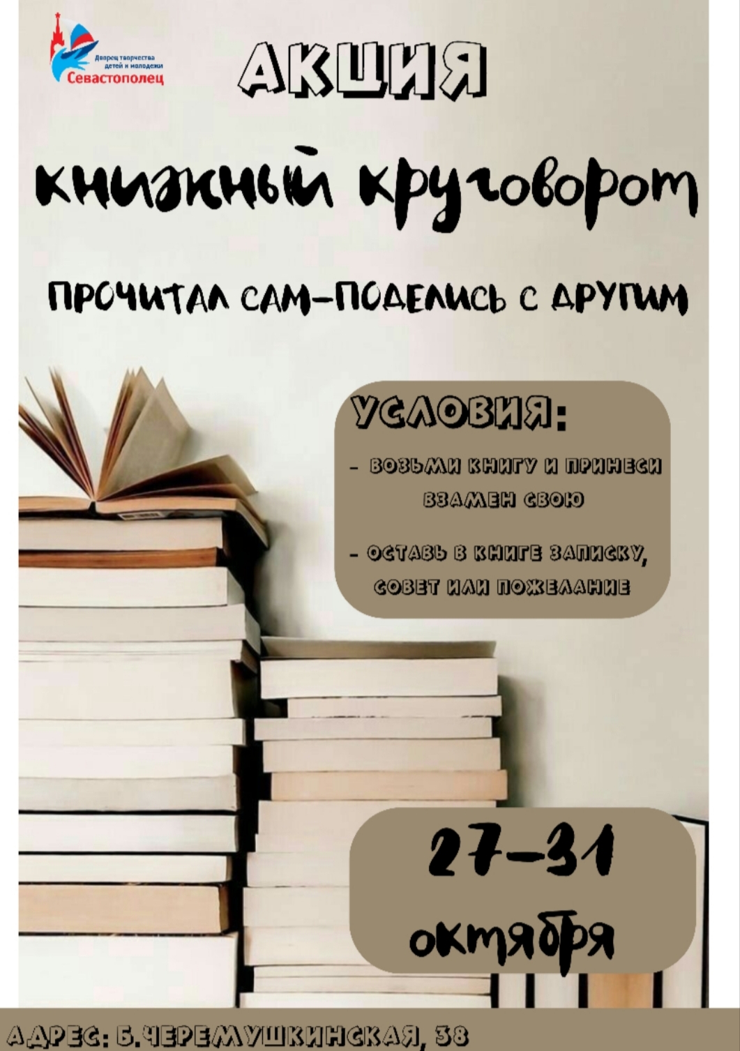 С 27 по 31 октября во Дворце творчества детей и молодежи «Севастополец» пройдет акция «Книжный круговорот: прочитал сам — поделись с другим»!