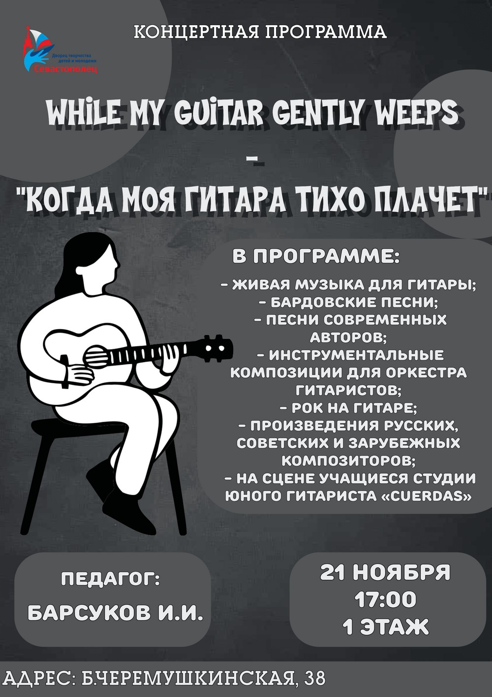 Для вас выступят талантливые ученики студии юного гитариста «Cuerdas» под руководством педагога И.И. Барсукова.