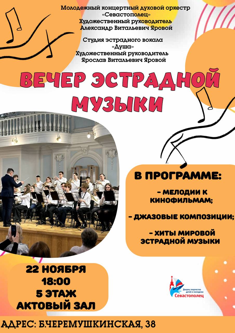 Приготовьтесь погрузиться в море звуков и эмоций! Нас ждёт незабываемый Вечер эстрадной музыки — настоящее путешествие сквозь ритмы и мелодии, которое согреет ноябрьский вечер!
