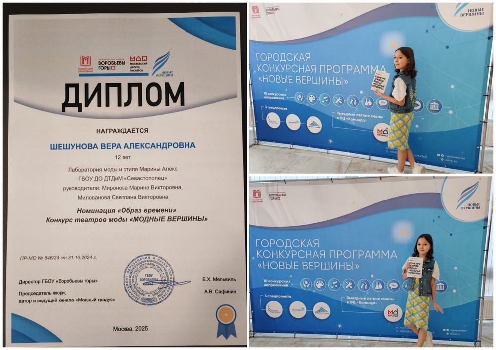 17 февраля в Московском дворце пионеров «Воробьёвы горы» состоялся Городской конкурс театров моды "МОДНЫЕ ВЕРШИНЫ", в котором с большим успехом приняла участие наша талантливая воспитанница Шешунова Вера. Это мероприятие прошло в рамках городской конкурсной программы "НОВЫЕ ВЕРШИНЫ", привлекая множество участников, стремящихся продемонстрировать свои творения.