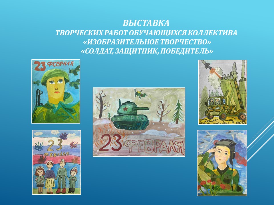 27 февраля в студии «Изобразительное творчество» педагога дополнительного образования Смирновой Елены Ростиславовны состоялась плановая выставка творческих работ «Солдат, защитник, победитель». В состав выставки включены творческие работы с изображением разных военных профессий и боевой техники. Этот праздник напоминает каждому мальчику, мужчине, о том, что он – защитник своей страны и семьи.
